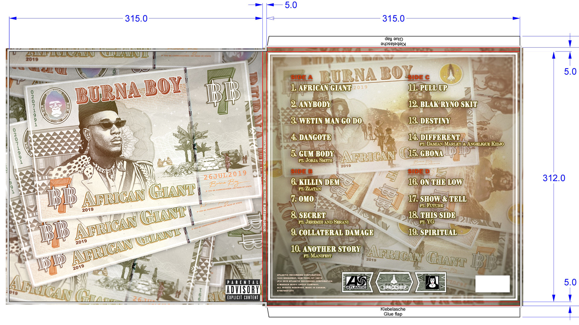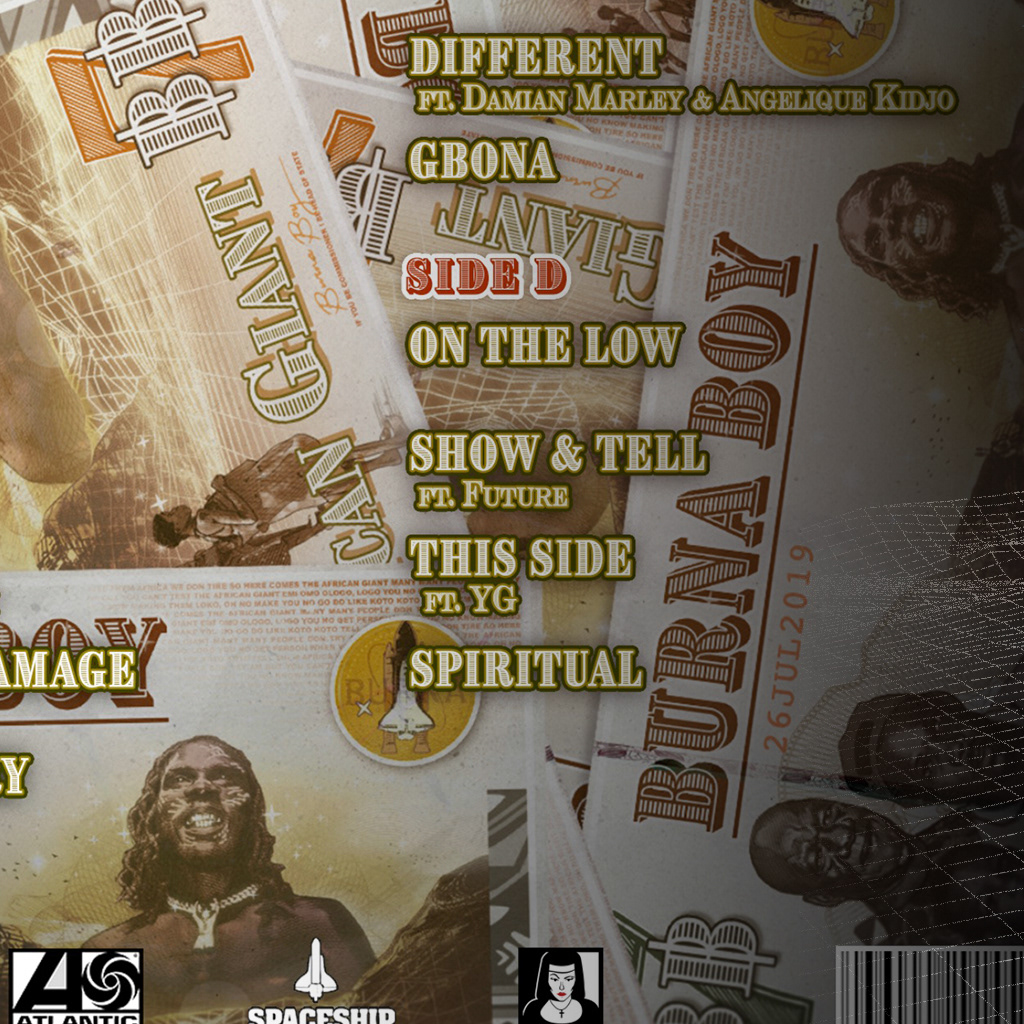 African Giant is the fourth studio album by Nigerian singer Burna Boy. It was released on July 26, 2019, by Spaceship Entertainment, Atlantic Records and Warner Music. The album is a mixture of Afrobeats, Afrobeat, dancehall, pop and hip hop. It was produced primarily by Kel P, along with production from Benjamin Zill, Dre Skull and Skrillex, among others. The album features guest appearances from Jorja Smith, Jeremih, Damian Marley and Future, among others. It was supported by eight singles, including "On the Low", which won Viewers' Choice at the 2020 Soundcity MVP Awards Festival, "Killin Dem", which won Song of the Year at the 2020 Soundcity MVP Awards Festival, among other awards; and "Anybody", which Burna Boy performed on Jimmy Kimmel Live!